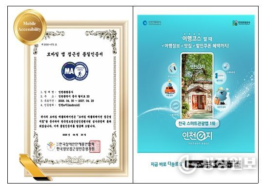 광장일보 주재영 기자 | 인천광역시(시장 유정복)는 스마트관광 플랫폼 ‘인천e지’ 앱(APP)이 관광약자를 배려한 서비스 구현의 우수성을 인정받아, ‘모바일 앱 접근성 품질인증(Mobile Accessibility)’을 3년 연속 획득했다고 밝혔다.