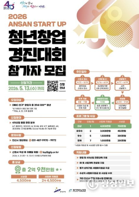 광장일보 주재영 기자 | 안산시는 창의적인 아이디어를 보유한 청년 창업가를 발굴하기 위해 내달 13일까지 ‘2026 안산 스타트업 청년창업 경진대회’ 참가자를 모집한다고 24일 밝혔다.