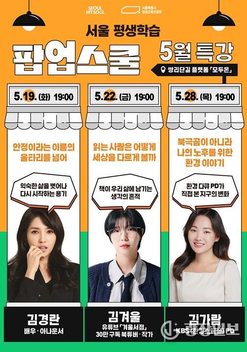 광장일보 주리아 기자 | 서울특별시평생교육진흥원이 지난 4월 도봉구 쌍문역 인근에 개관한 서울시 첫 역세권 평생학습 거점 ‘서울 평생학습 팝업스쿨’을 확대 운영한다. 시범운영 한 달간 500여 명이 참여했으며, 5월에는 정규강좌, 명사특강, 러닝숍 등 3개 영역에서 총 13개 과정을 편성하고, 650명의 시민 참여를 목표로 한다.