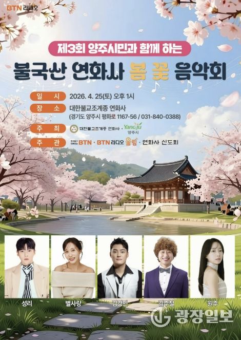 대한불교조계종 연화사와 양주시가 공동 주최하고 BTN불교TV, BTN라디오, 연화사 신도회가 주관하는 이번 음악회는 완연한 봄을 맞아 시민들에게 문화 향유의 기회를 제공하고 일상의 활력을 불어넣기 위해 마련됐다.