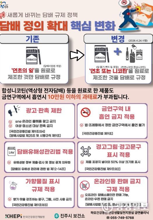 광장일보 주재영 기자 | 진주시는 담배의 정의를 확대한 '담배사업법' 개정안이 24일부터 시행됨에 따라 금연 구역에 대한 지도 점검을 강화한다고 밝혔다.