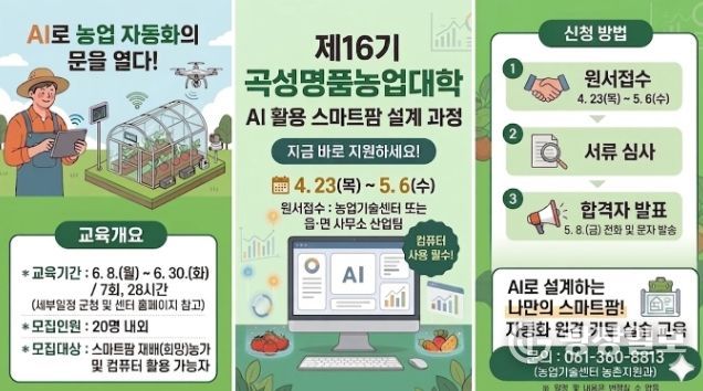 광장일보 주재영 기자 | 전남 곡성군이 미래 농업을 선도할 스마트농업 전문가 육성을 위해 ‘제16기 곡성명품농업대학 AI 활용 스마트팜 설계 과정’을 운영한다고 24일 밝혔다.