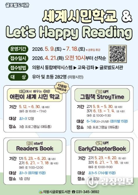 광장일보 주재영 기자 | 의왕시 글로벌도서관이 책을 통해 세상을 이해하고 체험하는 다문화 이해 프로그램 '어린이 세계 시민 학교'와 영어 읽기 문해력 향상을 위한 단계별 맞춤 프로그램 'Let’s Happy Reading'의 참여자를 모집한다.