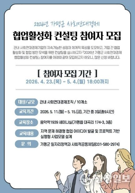 광장일보 주재영 기자 | 가평군이 사회연대경제 조직 간 협업 활성화를 위해 ‘2026년 사회연대경제 협업활성화 컨설팅’을 추진하고, 참여 조직을 5월 4일까지 모집한다.