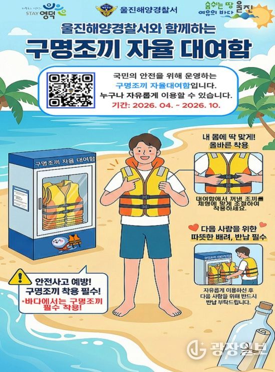 광장일보 주재영 기자 | 울진해양경찰서는 기존 해수욕장 개장 시기 구명조끼 자율대여함을 운영하던 것을 봄철 행락객 증가에 대비하여 조기 운영한다고 밝혔다.
