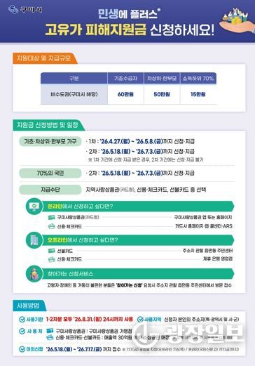 광장일보 주재영 기자 | 구미시는 고유가와 물가 상승으로 인한 시민들의 경제적 부담을 완화하기 위해 '고유가 피해지원금' 1차 신청·접수를 4월27일부터 시행한다.