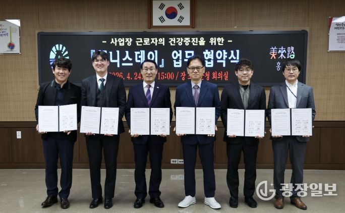 광장일보 나학천 기자 | 홍성군은 지난 24일 ㈜도원조경, 아모레퍼시픽 홍주점, ㈜트루 홍성지사, 한국농어촌공사 충남서부관리단 등 사업장 4개소와 충남서부근로자건강센터와 함께 근로자 건강증진을 위한 ‘웰니스데이’ 사업 업무협약을 체결했다고 밝혔다.