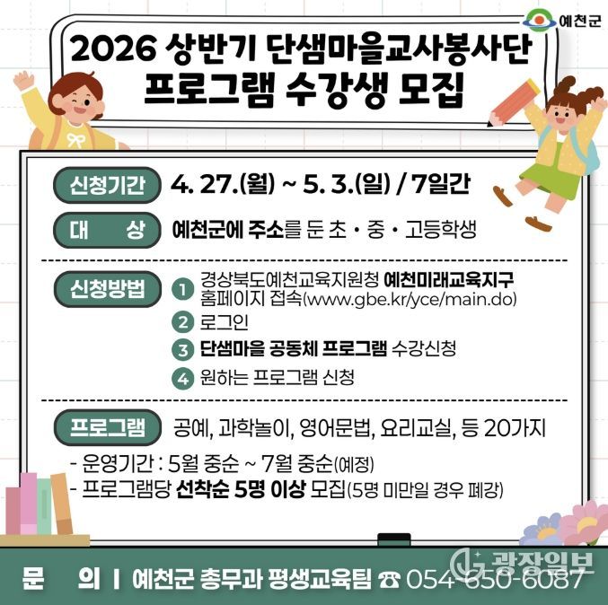 광장일보 주재영 기자 | 예천군은 4월 27일부터 5월 3일까지 2026년 상반기 단샘마을교사봉사단 프로그램 수강생을 모집한다.