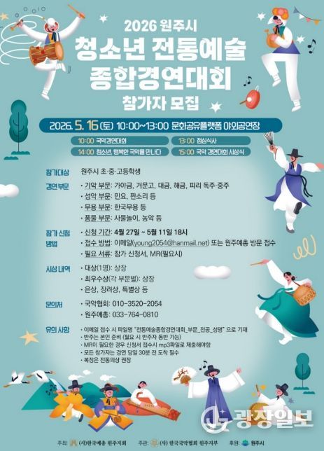 모집 부문은 ▲전통예술 종합경연대회 ▲청소년 트로트·가요·댄스 페스티벌 ▲원주청소년연극제 ▲학생음악콩쿠르 ▲치악산 전국 청소년 백일장 등 총 5개 분야다.