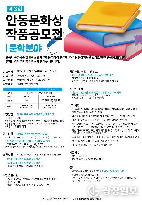 박덕규 안동문화상 운영위원장은 “올해 공모전은 문학과 미술 전반으로 참여의 폭을 넓히고 회화 분야를 통합 운영함으로써, 보다 자유롭고 다양한 창작을 이끌어낼 것으로 기대한다”며 “안동의 문화자원과 역사적 가치를 현대적 감각으로 풀어낸 작품들이 발굴돼, 지역문화의 새로운 가능성을 제시하는 계기가 되길 바란다”고 전했다.