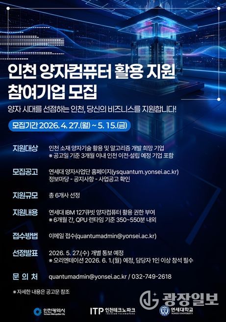 시는 연세대학교와 협력해 ‘2026년 인천 양자컴퓨터 활용 지원사업’에 참여할 기업을 모집한다.