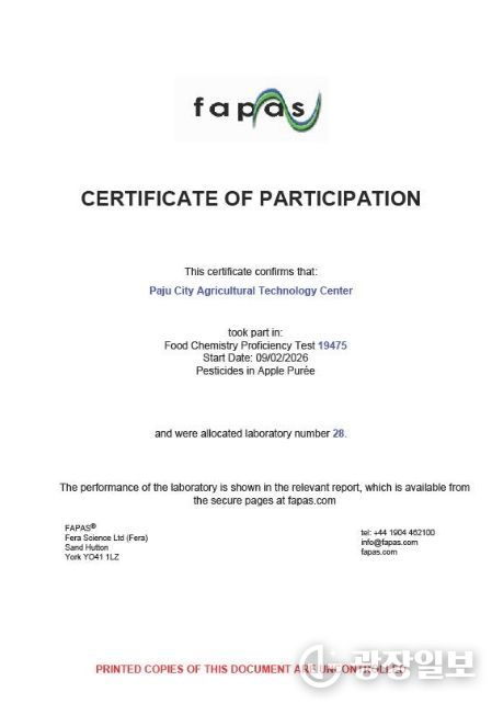영국 환경식품농림부 식품환경연구청(페라·FERA)이 주관하는 ‘국제분석능력평가’(파파스·FAPAS)는 전 세계 공인 분석기관들이 동일한 시료를 분석해 그 정확도를 상호 비교하는 권위 있는 평가 프로그램이다. 전 세계 60개 기관이 참여한 올해 평가(파파스 19475) 결과, 파주시 농산물 안전분석실은 사과 과립즙(퓨레) 시료에 대해 10개 잔류농약 성분을 분석해 제출한 전 항목에서 ‘만족’판정을 획득했다.