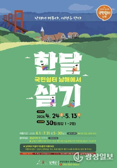남해군 ‘국민쉼터 남해에서 한 달 살기’는 경남 이외에 거주하는 만19세 이상 국민이면 누구나 참여 가능하며, 자세한 사항은 남해군 홈페이지 공고에서 확인할 수 있다. 남해군 관광진흥과장은 “2026년은 남해군이 체류형 관광지로 한 단계 도약하는 해가 될 것”이라며, “국민쉼터 남해에서 한 달 살기를 통해 더 많은 분들이 남해군의 매력을 깊이 경험하고, 남해와 특별한 인연을 맺는 계기가 됐으면 한다. 앞으로도 남해군을 다시 찾고 싶은 ‘국민고향’으로 만들기 위해 최선을 다하겠다.”고 밝혔다.