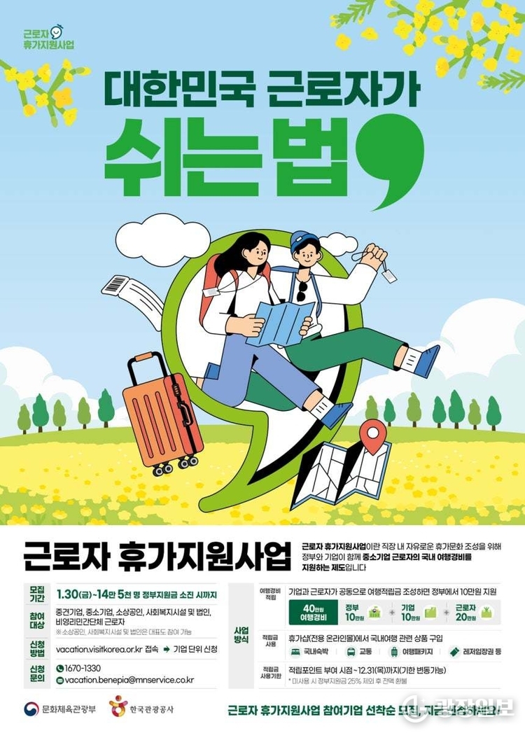 광장일보 =주재영 기자 | 문화체육관광부와 한국관광공사는 노동자 휴가지원 사업의 지원 대상을 14만5000명으로 확대하고, 지방 근로자에 대한 지원을 강화한다고 27일 밝혔다.