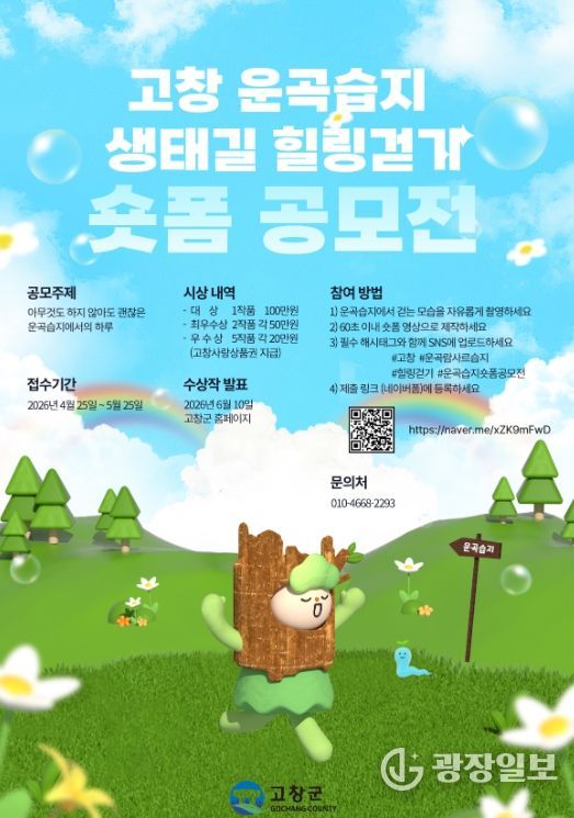 광장일보 주재영 기자 | 고창군이 람사르 습지도시의 매력을 널리 알리고, 방문객들에게 쉼과 여유를 선사하기 위해 ‘고창 운곡습지 생태길 힐링걷기’ 숏폼 공모전을 진행 중이다.