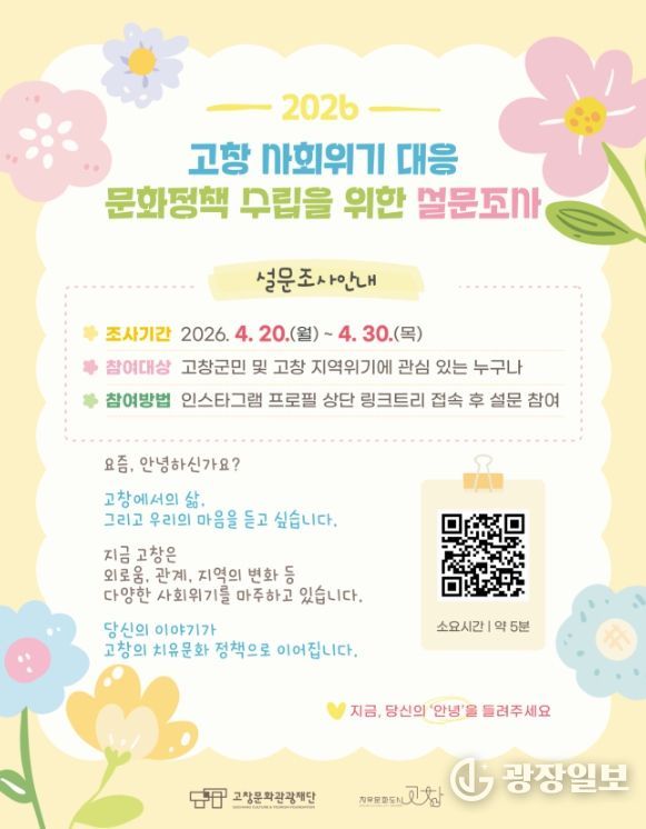 광장일보 주재영 기자 | 고창문화도시센터는 고창군이 직면한 사회위기 현황과 군민 인식을 파악하기 위해 ‘2026 고창 사회위기 대응 문화정책 수립을 위한 설문조사’를 추진한다.