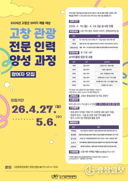 광장일보 주재영 기자 | 고창문화관광재단은 27일부터 지역 관광 활성화 및 수용태세 개선을 위해 ‘2026년 관광 전문인력 양성사업’ 참여자를 모집한다고 밝혔다.