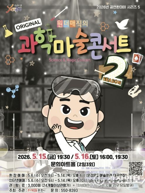 광장일보 주재영 기자 | 문경문화예술회관에서는 5월 어린이 달을 맞아 마술과 과학의 경계를 넘나들며 온가족 모두가 재미있게 관람할 수 있는 과학마술콘서트 시즌2 공연을 5월 15일 19:30, 16 16:00, 19:30 (2일 3회)에 문희아트홀에서 개최한다.