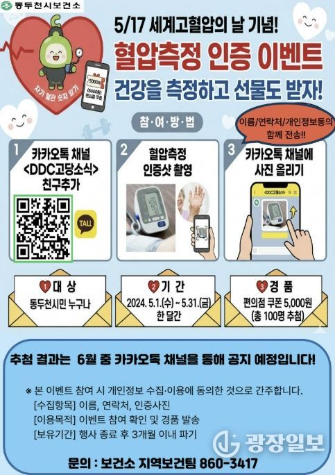 광장일보 주재영 기자 | 동두천시보건소는 오는 5월 17일 세계고혈압의 날을 기념해 시민들의 심뇌혈관질환 예방과 건강관리 실천을 유도하고자 ‘혈압측정 인증 이벤트’를 운영한다고 밝혔다.
