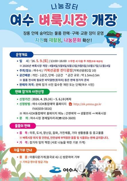 광장일보 주재영 기자 | 여수시는 오는 5월 9일 오후 1시부터 4시까지 거북선공원 잔디광장에서 ‘2026년 제2차 여수 벼룩시장’을 개최한다고 밝혔다.