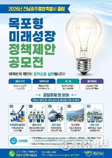 시 관계자는 “전남·광주 통합특별시 출범이라는 변화의 흐름 속에서 목포의 경쟁력을 높이고 지속가능한 성장을 이끌 정책 발굴이 중요하다”며 “참신하고 실현 가능한 정책 아이디어가 많이 제안되기를 기대한다”고 말했다.