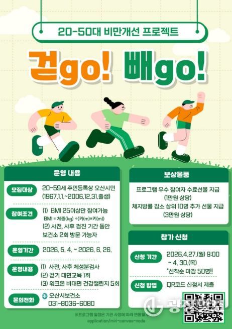 광장일보 나병석 기자 | 오산시보건소는 최근 젊은 층의 비만율 증가에 대응해 체질량지수(BMI) 25kg/㎡ 이상인 20~50대 오산시민을 대상으로 걷기 기반 비만 개선 프로그램 ‘걷GO 빼GO’를 운영한다고 밝혔다.