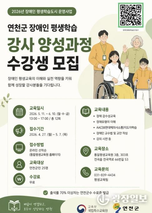 광장일보 주재영 기자 | 연천군은 교육부 국립특수교육원이 주관하는 '2026년 장애인 평생학습도시 운영 지원사업' 공모에 선정됨에 따라 장애인 평생교육 현장형 강사 양성 과정을 운영한다.