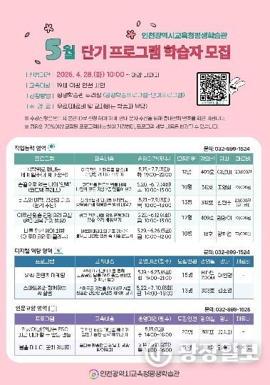 광장일보 주재영 기자 | 인천광역시교육청평생학습관은 인천 시민에게 다양한 배움의 기회를 제공하기 위해 오는 28일부터 ‘5월 단기 평생교육 프로그램’ 학습자를 모집한다.