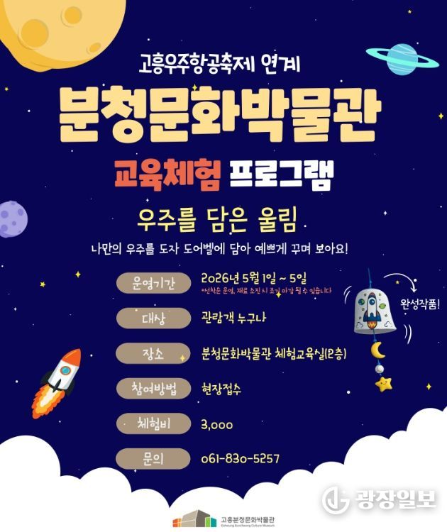 광장일보 주재영 기자 | 고흥군 분청문화박물관은 제16회 고흥우주항공축제와 연계해 관람객과 지역민을 대상으로 특별 교육체험 프로그램 ‘우주를 담은 울림’을 오는 5월 1일부터 5일까지 한시적으로 운영한다고 밝혔다.