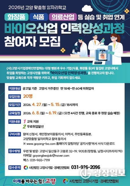 광장일보 주재영 기자 | 고양특례시는 2026년 고양맞춤형 일자리학교 공모사업 중 ‘바이오산업 인력 양성과정’의 참여자를 모집한다.