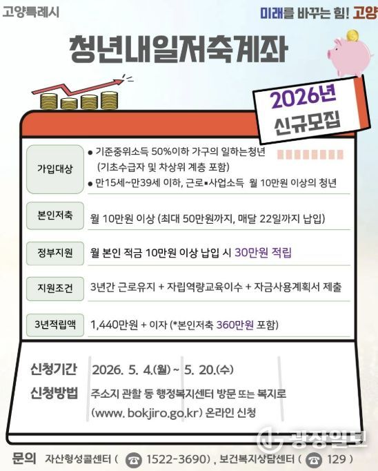 광장일보 주재영 기자 | 고양특례시는 5월 4일부터 시작하는 청년내일저축계좌 신규 가입자 모집을 앞두고, 가입 독려에 나섰다.