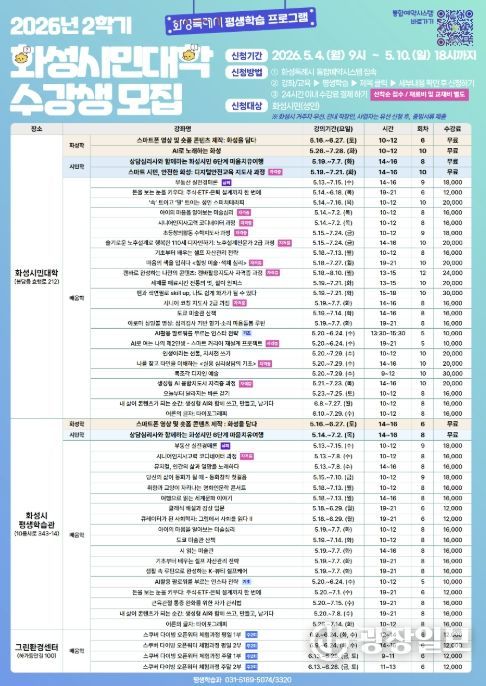 광장일보 나병석 기자 | 화성특례시는 2026년 화성시민대학 2학기 수강생을 오는 5월 4일부터 5월 10일까지 선착순으로 모집한다고 밝혔다.