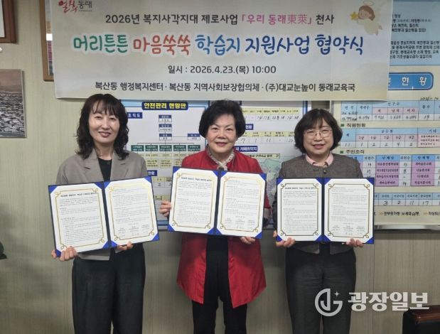 광장일보 주재영 기자 | 부산 동래구 복산동 행정복지센터는 지난 23일 복산동지역사회보장협의체, (주)대교눈높이 부산동래교육국과 ‘머리튼튼 마음쑥쑥' 학습지 지원사업 추진을 위한 협약을 체결했다고 밝혔다.