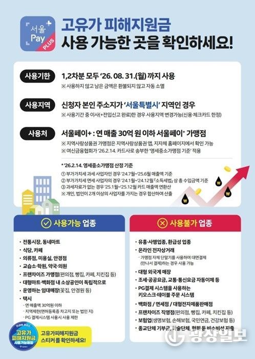 지원금은 행정안전부 지침에 따라 2026년 8월 31일까지 서울 소재 연매출 30억 원 이하 가맹점에서 사용 가능하고, 기한 내 사용하지 못한 잔액은 자동 회수된다. 또한 서울사랑상품권으로 지급된 지원금은 기존 상품권과 달리 ‘선물하기’ 기능은 제한된다.