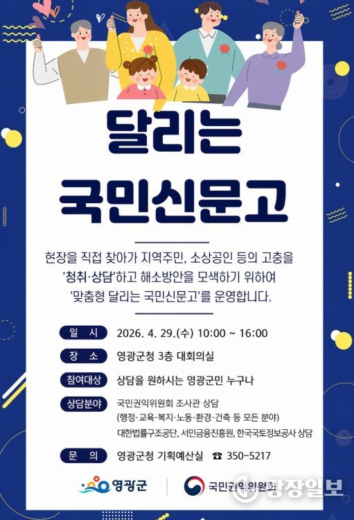 한편, 이번 상담은 별도의 사전 예약 없이도 참여 가능하며, 상담을 원하는 군민은 행사 당일 영광군청 3층 대회의실을 방문하면 된다.