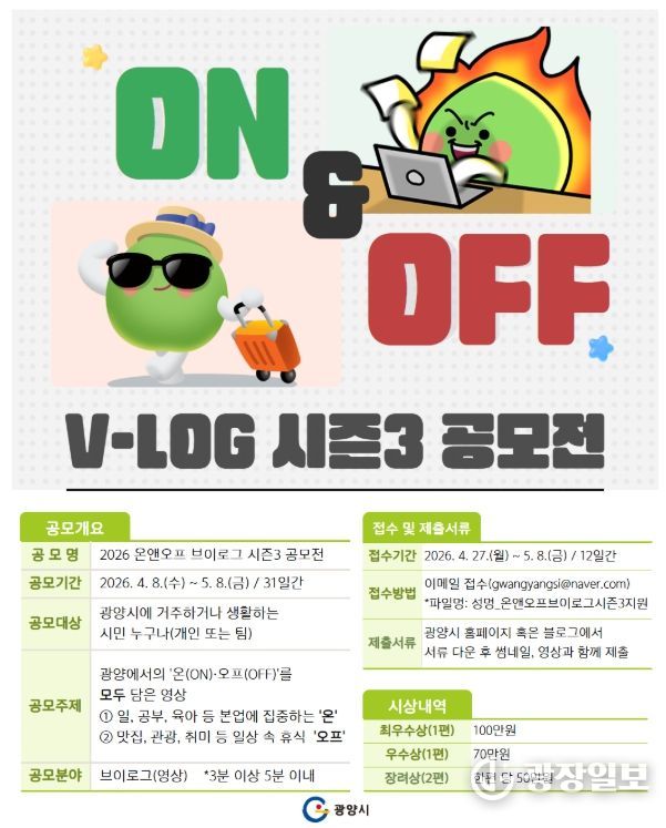 광장일보 주재영 기자 | 광양시는 시민의 시선으로 지역의 일상과 매력을 영상으로 담아내는 ‘2026 온앤오프 브이로그 시즌3’ 공모전 접수를 4월 27일부터 5월 8일까지 받는다고 밝혔다.