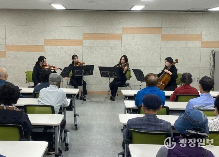 이날 공연에는 부산시립예술단 청소년교향악단 단원 4명(바이올린, 비올라, 첼로)이 참여해 ‘사랑의 인사’, ‘베토벤 바이러스’, ‘어머나’, ‘붉은 노을’ 등 다양한 곡을 현악 앙상블로 선보였다. 특히 익숙한 멜로디를 중심으로 구성된 프로그램은 어르신들의 높은 호응과 적극적인 참여를 이끌어냈다.