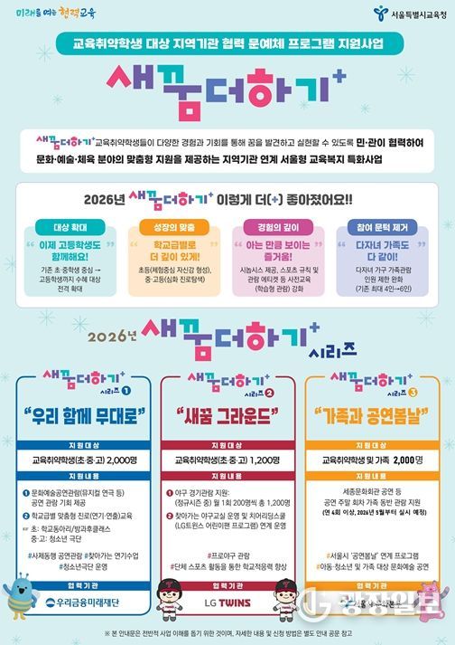 광장일보 주리아 기자 | 서울특별시교육청은 교육취약학생에게 문화·예술·체육 및 진로탐색 기회를 제공하는 민관협력 교육복지 사업 ‘새꿈더하기’를 2026년 더욱 확대 운영한다고 밝혔다.