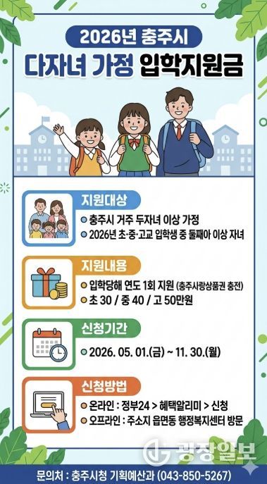 광장일보 이현나 기자 | 충주시는 다자녀 가정의 경제적 부담을 완화하고 안정적인 양육 환경을 조성하기 위해 2026학년도 초·중·고등학교에 입학하는 둘째 자녀 이상에게 입학지원금을 지원한다고 밝혔다.