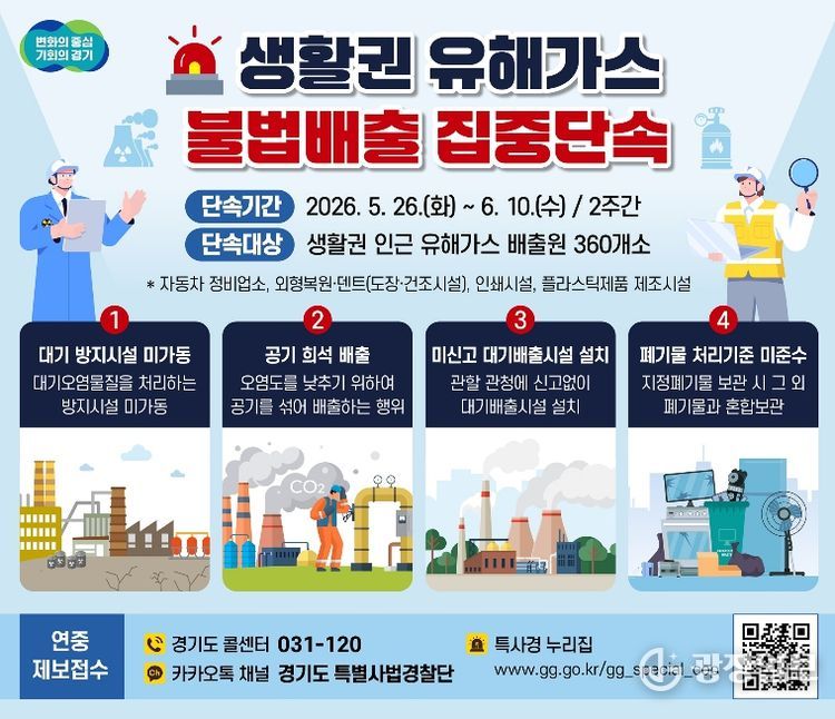 권문주 경기도 특별사법경찰단장은 “생활권 인근 유해가스 불법배출은 도민 건강을 직접적으로 위협하는 중대한 환경범죄”라며 “집중단속을 통해 불법행위를 철저히 근절하고 도민이 안심할 수 있는 쾌적한 대기환경을 조성하겠다”고 말했다.