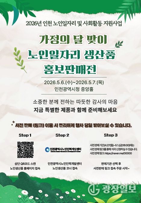 광장일보 주재영 기자 | 인천시가 2026년 노인일자리 사업을 대폭 확대하고, 5월 가정의 달을 맞아 어르신들이 직접 제작한 생산품을 시민들에게 선보이는 홍보·판매 행사를 개최한다.