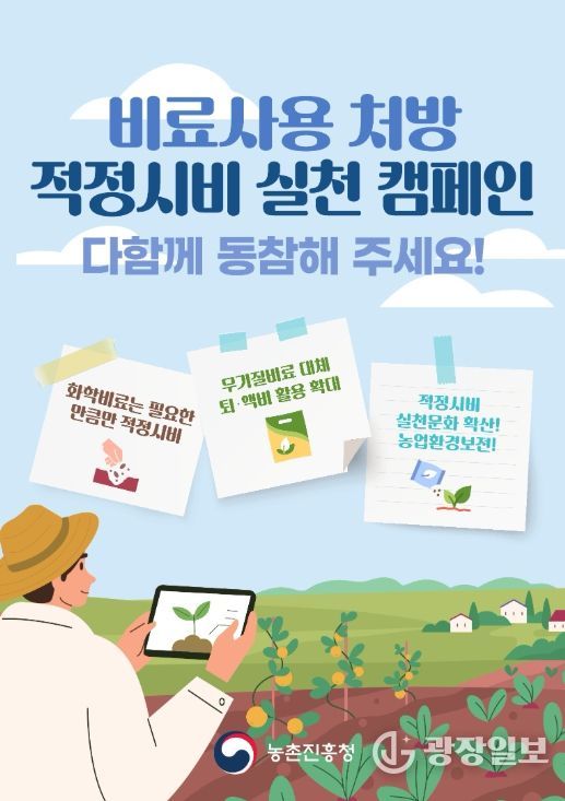 캠페인 기간 동안 농업인 학습단체 행사 및 품목별 교육과 연계해 ▲비료사용처방서 발급 후 비료 살포 ▲가축분 퇴·액비 활용 확대 ▲공익직불제 비료 사용기준 준수 등을 홍보할 계획이다.