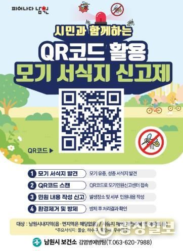 광장일보 주재영 기자 | 남원시보건소가 여름철 모기 매개 감염병 예방과 시민 편의를 위해 스마트폰 GPS 위치 정보를 활용한 'QR코드 모기 서식지 신고제'를 운영한다고 밝혔다.