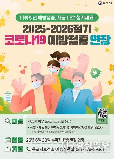 광장일보 주재영 기자 | 목포시는 2025~2026절기 코로나19 예방접종사업 기간을 오는 5월 1일부터 6월 30일까지 2개월간 연장 운영한다고 밝혔다.