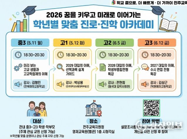 전주교육지원청은 오는 5월 11일부터 6월 12일까지 전주교육지원청 영재교육원 시청각실에서 중3~고3 학생과 학부모를 대상으로 ‘2026년 꿈을 키우고 미래로 이어가는 학년별 맞춤 진로·진학 아카데미’를 운영한다고 28일 밝혔다.