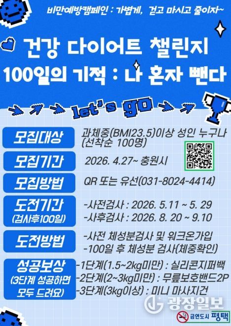 광장일보 주재영 기자 | 평택시는 시민들이 스스로 비만 관리 능력을 키우고 건강한 생활 습관을 정착시킬 수 있도록 돕는 비만 예방 프로그램 '100일의 기적’참가자를 모집한다고 밝혔다.