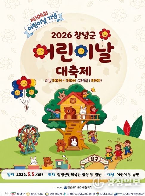 광장일보 주재영 기자 | 창녕군아동위원협의회는 오는 5월 5일 제104회 어린이날을 맞아 지역 어린이와 가족이 함께 즐길 수 있는 ‘2026년 창녕군 어린이날 대축제’를 창녕군민체육관 광장에서 개최한다고 밝혔다.