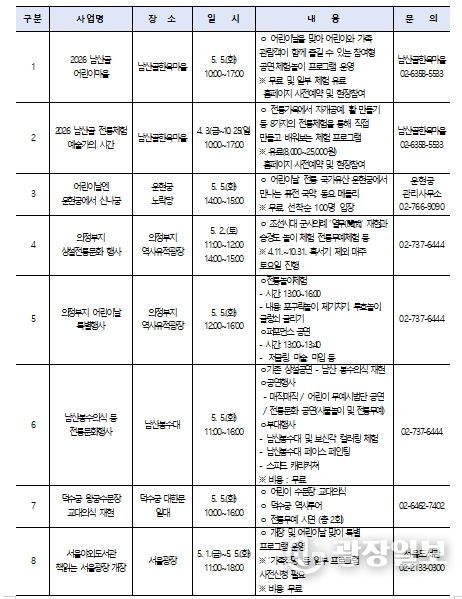 서울역사박물관 어린이박물관에서는 '한양에서 놀자!'(5.5.) 행사를 통해 공방·체험 프로그램 등이 진행되며, 경희궁에서는 독서 프로그램 '책 읽으라궁' (5.5., 5.10.)이 진행된다. 어린이 대상의 체험형 기획전시도 운영되고 있다.