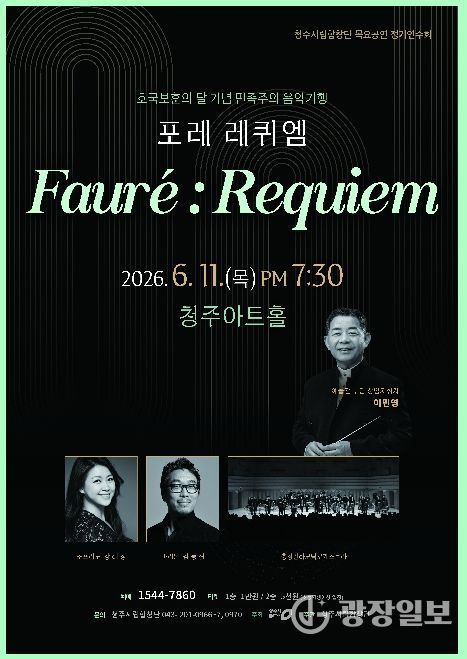 광장일보 이현나 기자 | 청주시립합창단은 6월 11일 오후 7시 30분 청주아트홀에서 호국보훈의 달 기념 민족주의 음악여행 ‘포레 레퀴엠’을 선보인다고 29일 밝혔다.