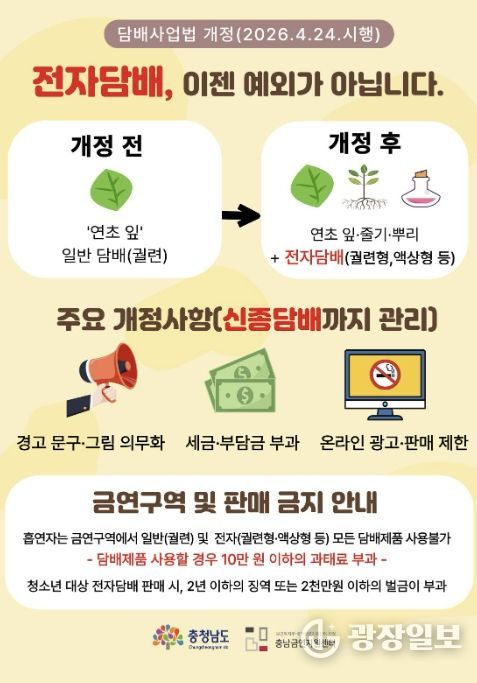 광장일보 주재영 기자 | 4월 24일부터 '담배사업법' (이하 법) 개정 시행으로 액상형 전자담배를 포함한 모든 니코틴 제품이 ‘담배’로 규정된다. 그동안 규제 사각지대에 있던 합성니코틴 전자담배까지 관리 대상에 포함되면서 시민들의 혼란이 예상되는 가운데, 아산시는 금연환경 조성을 위한 대응에 나섰다.